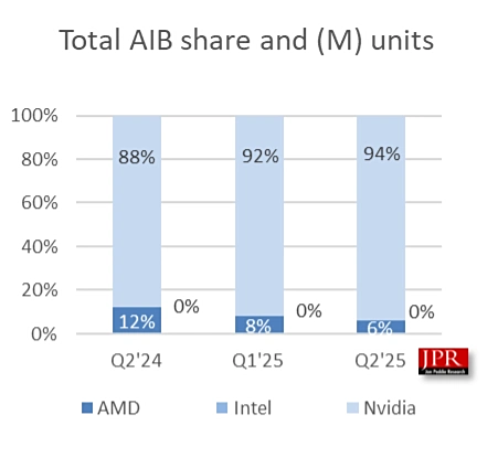 IT之家 9 月 3 日消息,分析机构 Jon Peddie Research 在公布 2025 年第二季度整体 PC GPU 销售状况的同时还提供了有关 PC GPU AIB(IT之家注:即独立显卡)的更详细数据。